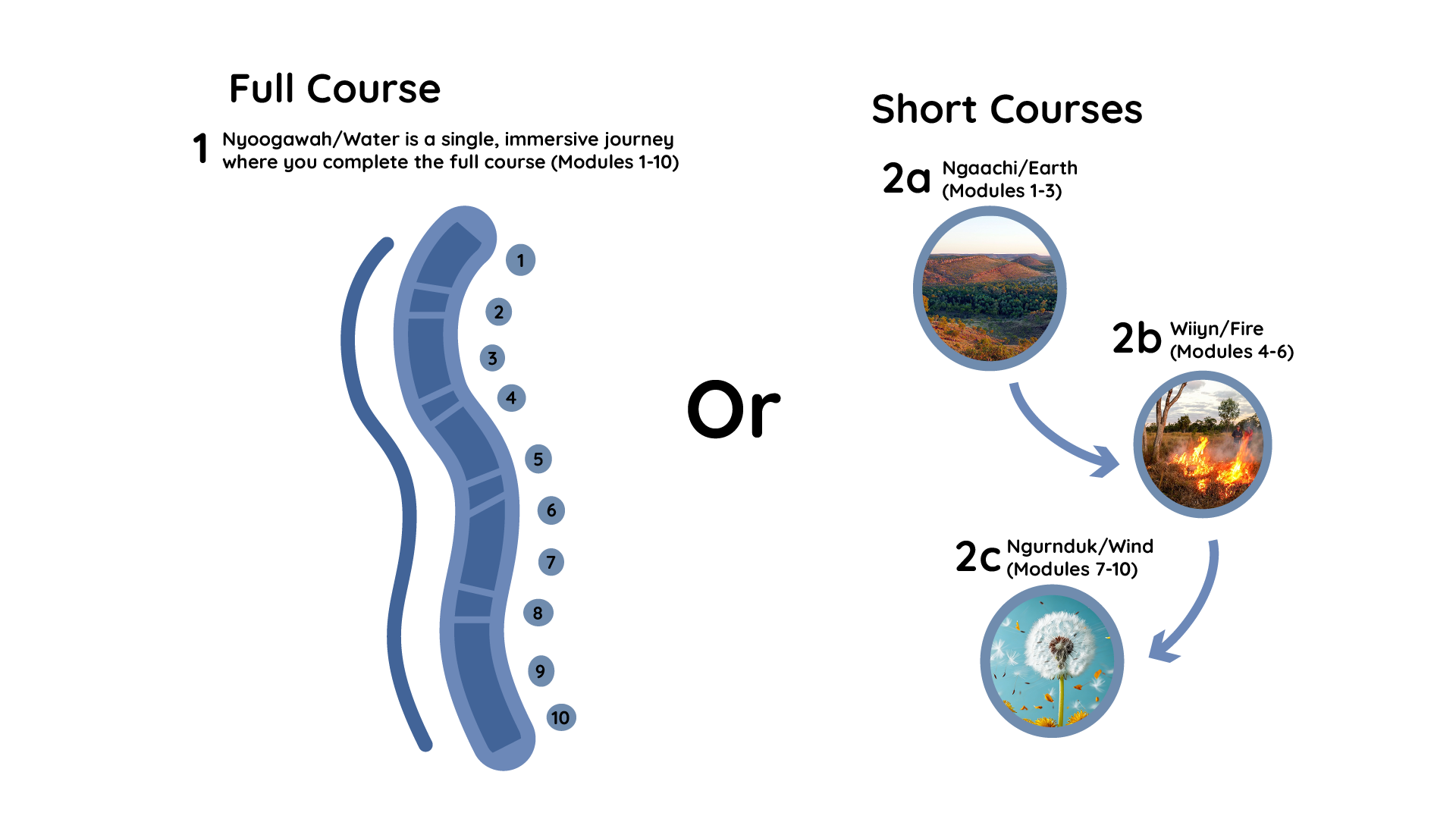 a. Ngaachi/Earth (Short-Course 2a – Modules 1-3) b. Wiiyn/Fire (Short-Course 2b – Modules 4-6) c. Ngurnduk/Wind (Short-Course 2c – Modules 7-10)